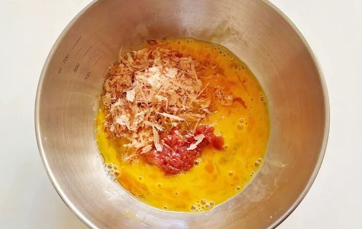 続いて、ボウルに卵2個を割り入れ、叩いた梅干し、カツオ節を加えて混ぜ合わせましょう。