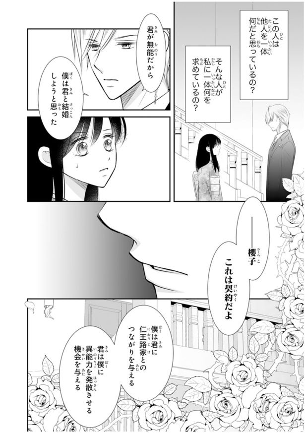 超常の力“異能”が尊ばれる日本の自治州・至間國。この地で男爵令嬢として生まれ落ちた相良櫻子は、異能を持たない“無能”として、家族にさえ虐げられ生きてきた。居場所も逃げ場もない中で、19歳の櫻子に突如縁談の話が舞い込む。相手は名家の強力な異能者・仁王路静馬。銀髪・緋色の瞳と特殊な容貌の彼は、とある思惑から無能の櫻子を妻として選んだようで……? 仕向けられた契約結婚からはじまる和風シンデレラストーリー『無能令嬢の契約結婚』をお楽しみください。