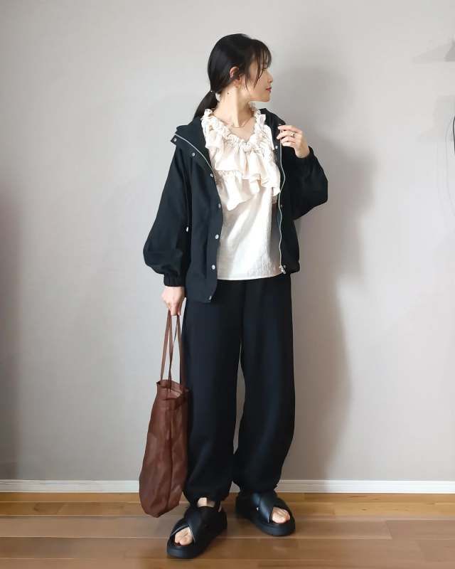 最後にご紹介するのは、ふんわりフリルブラウスと黒スウェットパンツを合わせたコーデ。ガーリーとカジュアル、そんな正反対な印象の両アイテムですが、組み合わせると意外にもおしゃれにマッチするんです。ブラウスの上品さがスウェットパンツの部屋着感を解消してくれます。