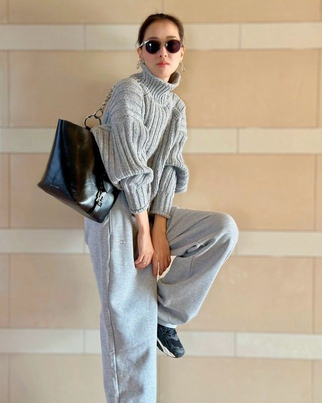 こちらは、スウェットパンツと同色のざっくりニットを組み合わせたおしゃれコーデ。ニットで程よい立体感をプラスすることで、カジュアルなパンツコーデの奥行きがアップします。きれいめ小物を添えて、さらに大人っぽくまとめるのがおすすめです。