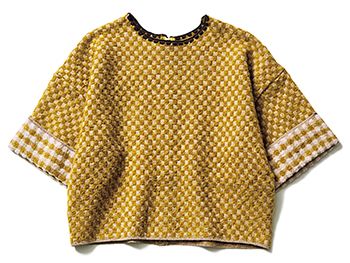 キャメル×ブラウンチェック柄プルオーバー/ババコ ブークレー糸の起毛感が目を引く古典的な模様。そで口の折り返しや、首元のハマグリ刺しゅうがアクセントに。
