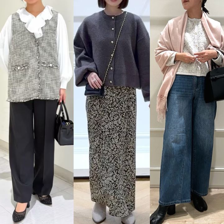 深めVネックのツイードジレは、きちんと感が欲しいときや同窓会などにおすすめのきれいめアイテムです。ロング丈がお腹まわりをさりげなくカバーしてくれるのも高ポイント。明るいグレーは一年を通して長く着られるため、コスパも抜群です。