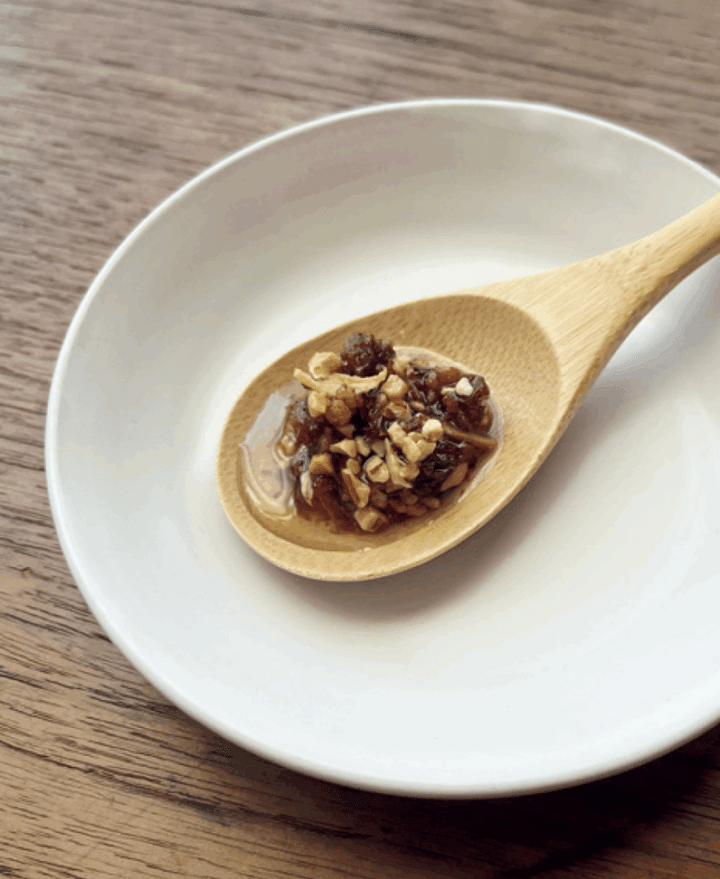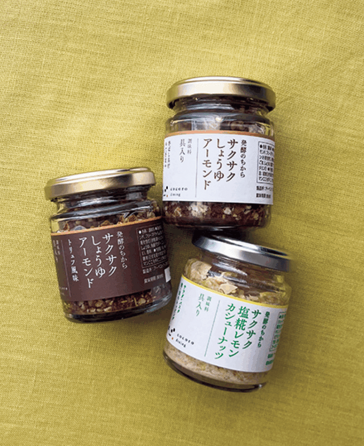 もろみを配合したフリーズドライ醤油をベースに、ローストアーモンド、フライドオニオン、フライドガーリックなどを加えたトッピング調味料です。