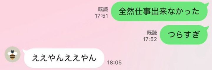 毎日仕事をしているとうまくいかない日や自己嫌悪まっしぐらの日もありますよね。そんな時に夫にLINEで愚痴を送りました。すると、夫から「ええやんええやん」と、たったそれだけの文面ですが、否定するわけでもなくアドバイスするわけでもない、ただ静かに「ええやん」だけの言葉だからこそ救われたのですね。