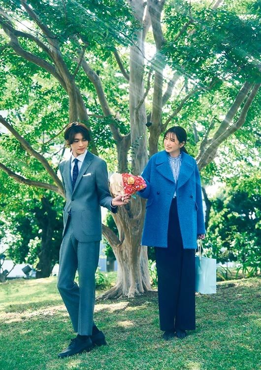 [別府さん]ジャケット¥26,950、パンツ¥13,970、シャツ¥8,470、タイ¥14,850/以上グリーンレーベル リラクシング(ユナイテッドアローズ グリーンレーベル リラクシング 自由が丘店) シューズ¥26,950/アシックス ウォーキング(アシックス商事) チュッパチャプス フラワーブーケ¥1,100/クラシエ