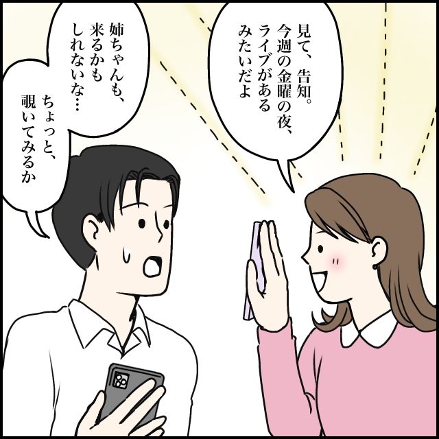 SNSを眺めていると、今週の金曜の夜にライブがあるという告知を発見。それを太一に見せると、「姉ちゃんも来るかもしれないな・・・ちょっと覗いてみるか」と言いました。私たちは、行方をくらませた玲美さんを探すため、QT-BOXのライブ会場に行くことにしたのでした。