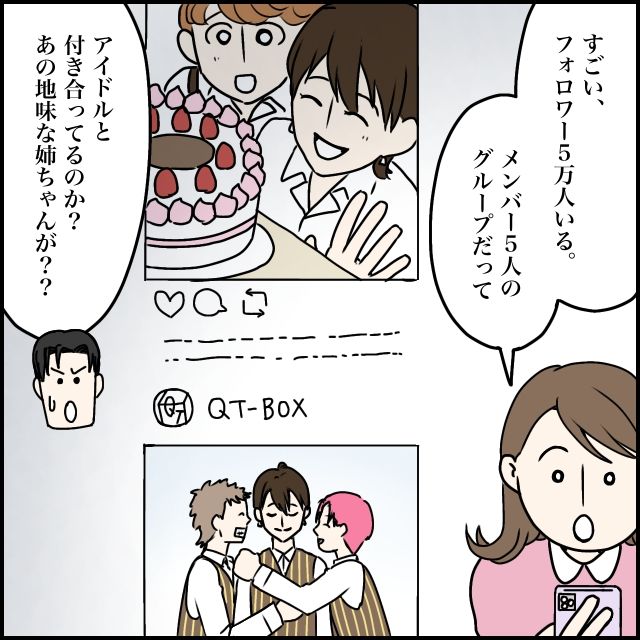 『QT-BOX』は、5人のメンバーで構成された男性アイドルグループ。SNSのフォロワーは5万人で、アイドルとしてはまだ駆け出しのようでした。太一は、「アイドルと付き合ってるのか?あの地味な姉ちゃんが?」と驚きを隠せない様子。
