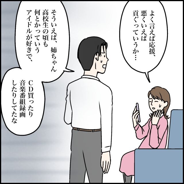 「よく言えば応援、悪く言えば貢ぐっていうか…」そう説明すると、太一は何かを思い出したように「そういえば姉ちゃん、高校生の頃も何とかっていうアイドルが好きで、CD買ったり音楽番組録画したりしてたな」と言いました。