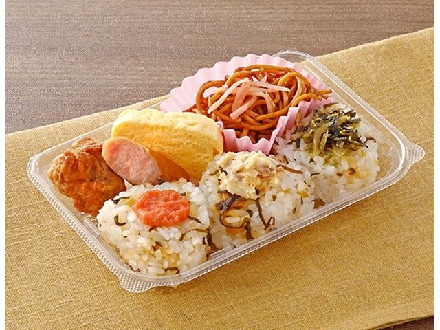 くらこんの塩こんぶを混ぜ込んだミニおにぎり3種と、唐揚げ、ウインナー、玉子焼、焼そばを盛り付けました。人気のおかずとの組み合わせで幅広いお客様に支持いただける仕立てです。 カロリー:382kcal 【販売地域】近畿