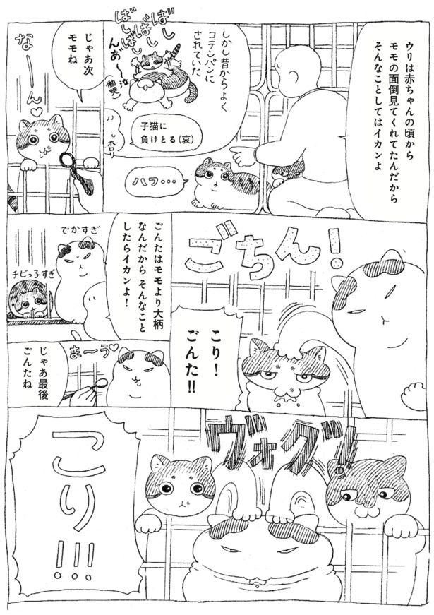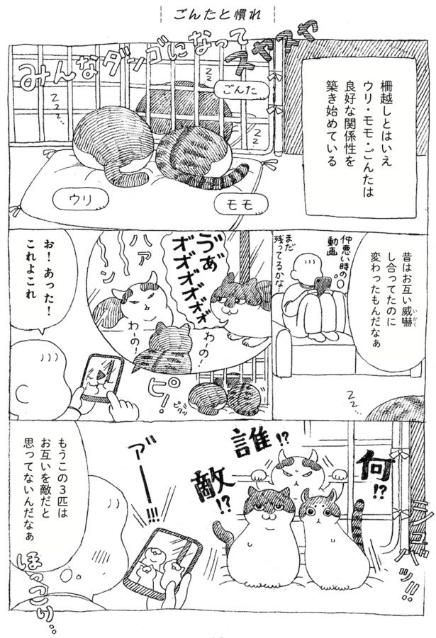 ふてぶてしい顔にどっしりとした身体、「キェ」と変な声で鳴く、元野良猫のごんた。野生時代の名残を感じさせながらも、少しずつ家猫として打ち解けていく様子に愛しさが止まりません。