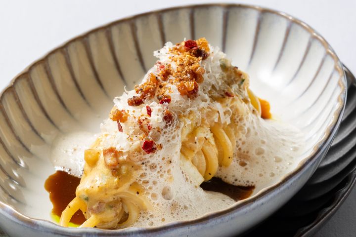 コースのハイライトは、ラツィオ州のグアンチャーレ生産者から直接その背景や食材に触れるという貴重な体験から生まれた「セルジオのカルボナーラ」。カルボナーラ本来の濃厚さを大切にしながらも、魚介やハーブを巧みに取り入れ軽やかで優しい口当たりに。セルジオ シェフはパスタに細切りの烏賊を忍ばせるという手法を考案し、グアンチャーレの豊かな食感とほのかなミネラル感のある旨みを表現。車海老の特製ビスクソースが複雑な奥行きをもたらし、山と海の恵みが融合した新しいカルボナーラを完成させました。