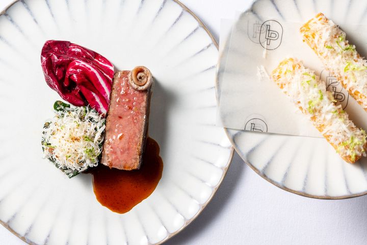 メインは、肉本来の旨みを引き立てる塩味と心地良い苦みが重なり合う「国産あか牛」。山岳地帯を擁するラツィオ州の食文化に根付くアンチョビとほろ苦いラディッキオ(チコリ)、さらに“リパッサータ(再加熱)”という郷土に伝わる調理法で仕上げたホウレン草が添えられています。