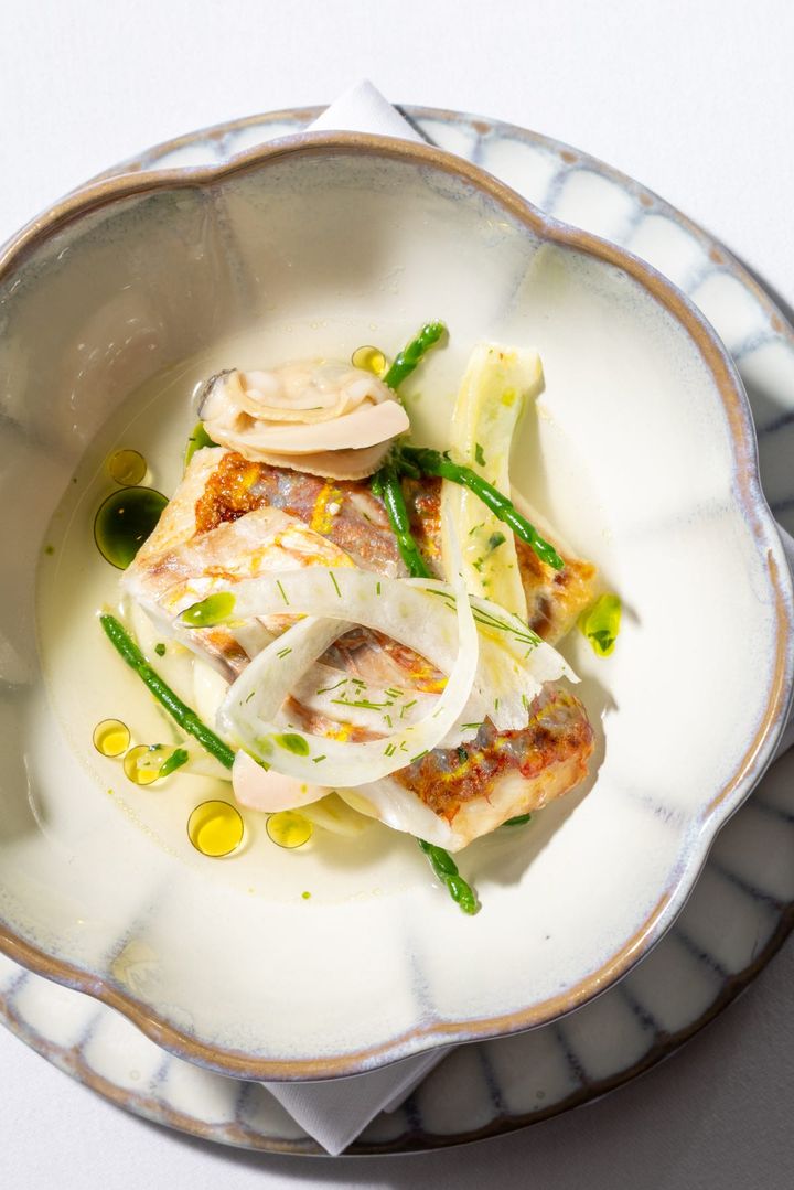 アブルッツォ州の郷土料理を再解釈した「イトヨリのブロデット」は、日本ならではのイトヨリと蛤を使用し、魚介の澄んだ旨味をストレートに感じられるような調理方法に。そして、アブルッツォ州で親しまれる羊肉とレンズ豆が主役の「ラムネックのブレゼ」は、柔らかく煮込んだラムの旨みと豆の素朴な甘み、キャラメリゼオニオンのフォームが重なり合う滋味深くも洗練されたひと皿です。