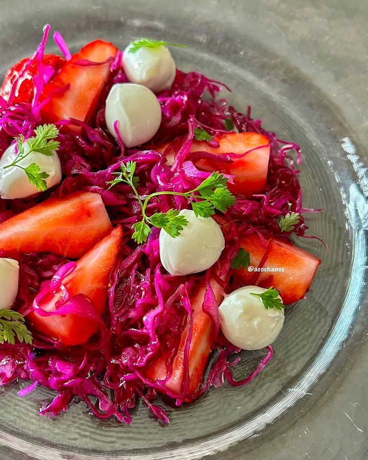 こちらの「いちごのサラダ」は、紫キャベツのマリネと和えてからグレープシードオイルをかけています。