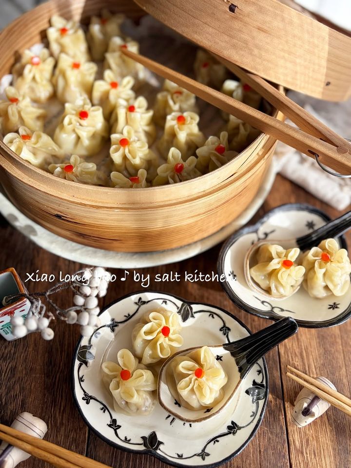 小籠包のようにも見えますが、実は餃子で、お花に焦げ目がつかないよう蒸しているそう。味付けはしっかりめなので、「カンタン酢+黒こしょう+刻み生姜」のさっぱりとしたつけダレと相性◎。