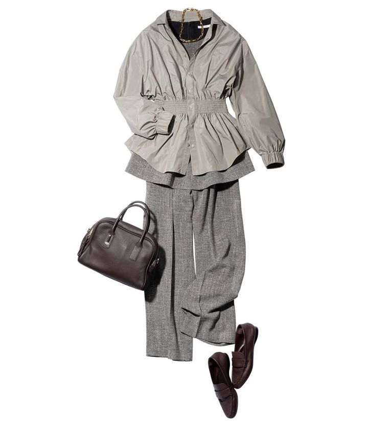 ブルゾン¥36,300(THIRD MAGAZINE)ペプラムトップス¥31,900パンツ¥30,800(ともにカデュネ/カデュネ プレスルーム)バッグ¥28,600(ロウェル シングス/アバハウスインターナショナル オンラインストア)ローファー¥61,600(ダブルスタンダードクロージング/フィルム)ネックレス¥99,000(アビステ)
