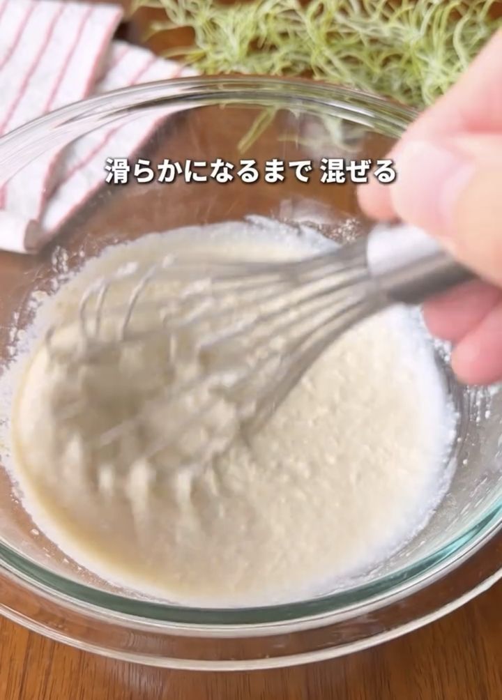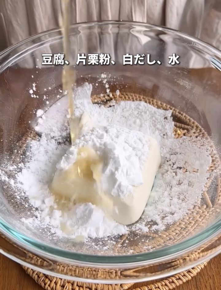 まずは、ボウルに絹豆腐、片栗粉、白だし、水を入れて混ぜ合わせます。