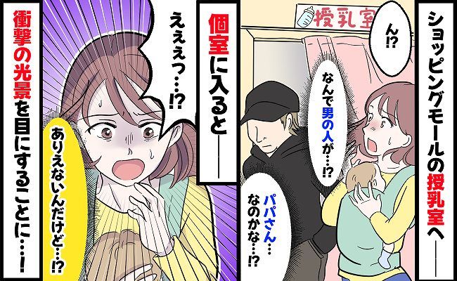 息子がまだ生後5カ月くらいのころのことです。久しぶりにショッピングモールに家族で出かけて、息子の授乳のために、夫に荷物を任せて授乳室に向かいました。すると、1人の男性が出てきたのです。最初はパパさんなのかな? と思ったのですが……!?