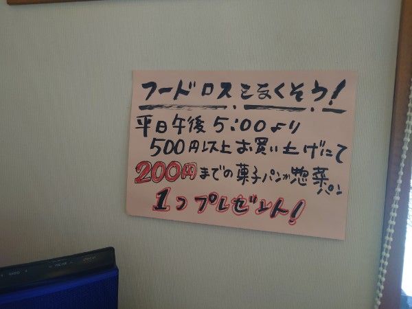 平日の午後5時より500円以上お買い上げで、200円までの菓子パンか惣菜パン1つプレゼント。