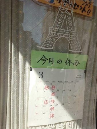お店の休みは火曜日ですが月により、ほかの曜日がお休みになるときがあるそうです。お店に貼ってあるカレンダーでご確認ください。