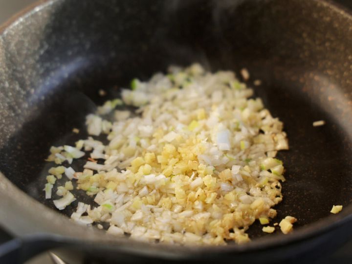 ① フライパンにごま油をひき、みじん切りにした長ネギと生姜を入れたら、火を点け香りが立つまで中火から中弱火で炒める。