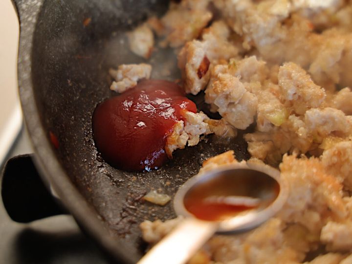 ② 鶏ひき肉を入れて焼き付け、表面の一部がこんがりしてきたら、崩しながら炒める。