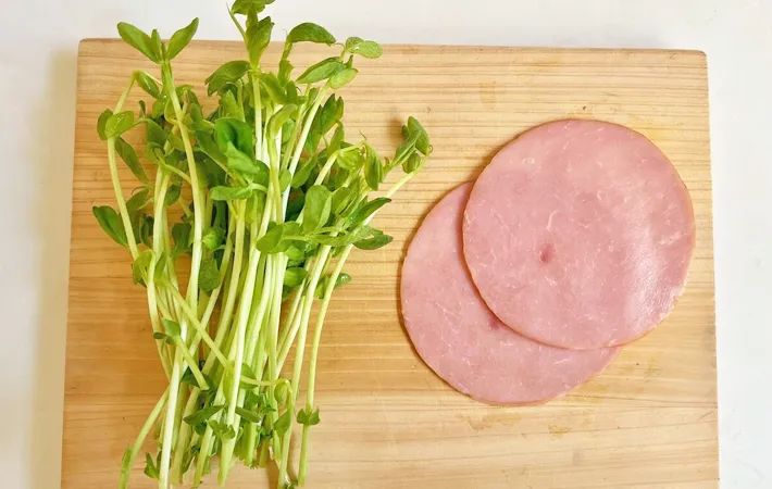 この時点で、豆苗のグリーンとハムのピンクで彩りが豊かになりました。完成を前に期待が高まります!