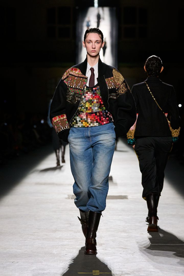ヴァン・ノッテンに似て、クラウスナーには思いもよらない組み合わせを見事に調和させる才能がある。カレッジジャケットと刺繍リボンで飾られたスカート、煌びやかなブロンズのジャカードコートとリブニットの袖、デニムジャケットとシルク糸、スパンコール、ガラスビーズで表現したピクセルプリントといった具合に。ショーのクライマックスには、これまた刺繍リボンがランダムにあしらわれたジャケットが2着登場した。