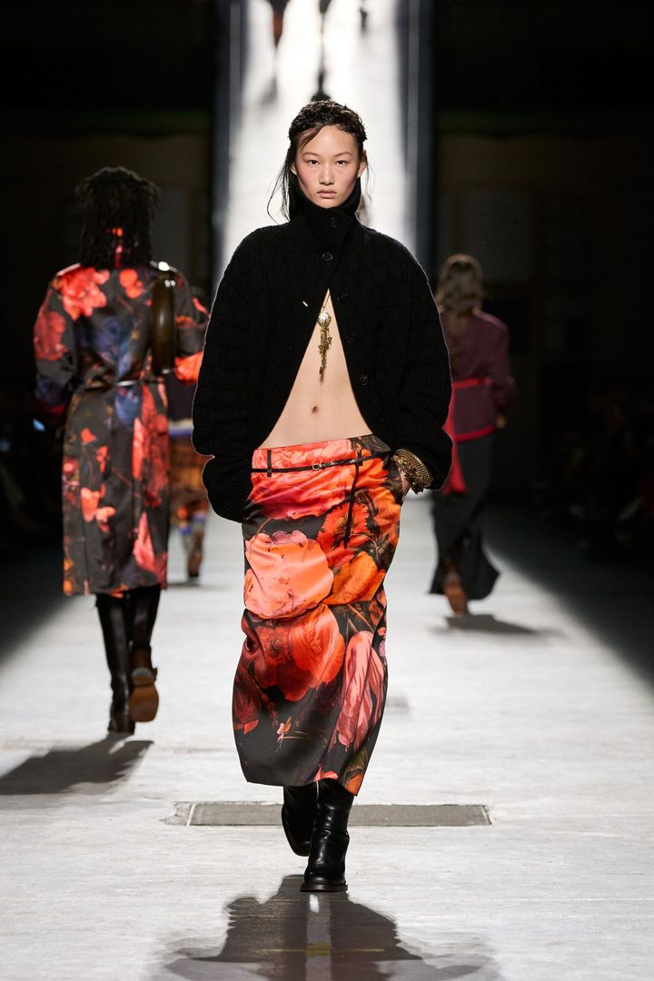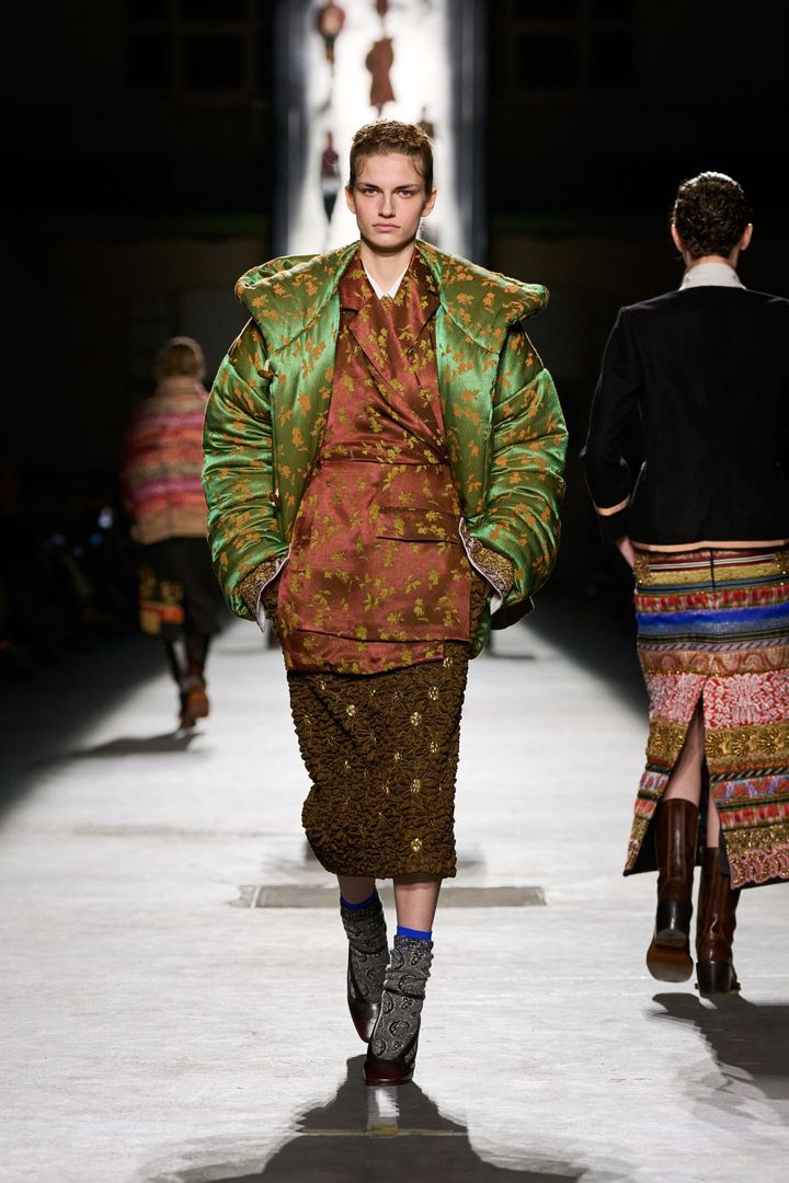 ドリス ヴァン ノッテンの過去の印象的なショー同様に、今シーズンの魅力は、装飾やぶつかり合う柄、重なり合う模様、静物画をピクセル化したプリントにあるのではない。ジャケットや厚手のセーター、ブーツなど、手持ちの服に合うリアルクローズが展開されるから、多くの人の心に響くのだ。