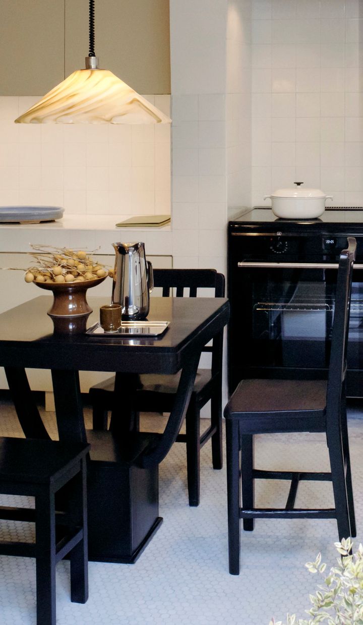 ショップらしからぬ親密な空気をつくり出すのが、キッチンだ。家具はエンツォ・マーリやカーラ・ヴェノスタのものが選ばれ、上海のヴィンテージマーケットで見つけたアイテムやオブジェと組み合わせられた。キッチンには中国・成都を拠点とする陶芸家のリー・チンがルメールのためにデザインした陶芸作品も置かれ、日常的にお店で使われる。