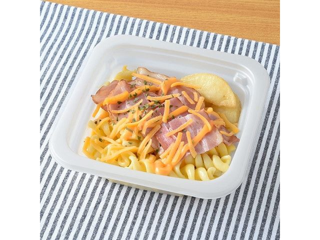 濃厚なチーズソースで和えたマカロニに、ベーコンとチェダーチーズをのせたおつまみにぴったりの商品です。