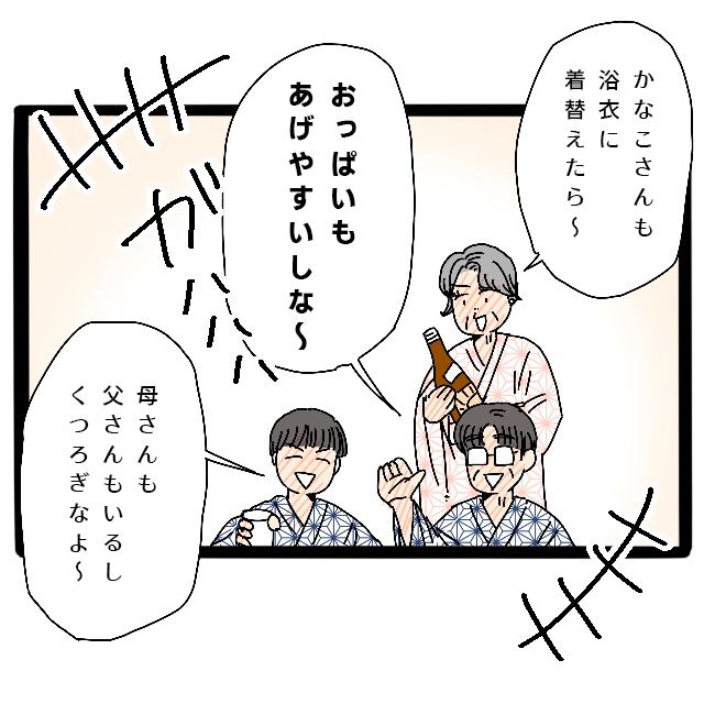 すると義母が、「かなこさんも浴衣に着替えたら?」と声をかけてきました。たしかにその方が楽かもしれない・・・そう思って立ち上がろうとした瞬間、義父が「おっぱいもあげやすいしな~」とセクハラ発言をしてきました。