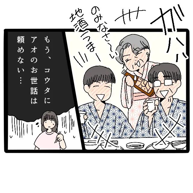 夕食の時間になっても、3人は相変わらずお酒を飲んで大盛り上がり。顔を真っ赤にして大声で笑い合い、楽しそうにしています。コウタもすっかり酔っぱらってベロベロ。あの状態では、アオのお世話なんてとても頼めそうにありません。
