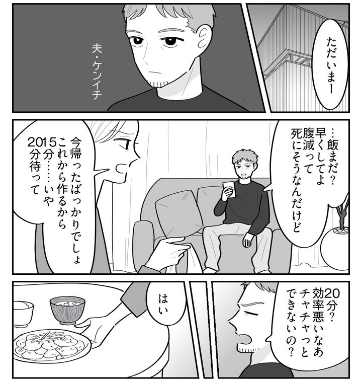その日も「早く飯を出してくれ」と言うケンイチに急かされ、私はバタバタと20分でご飯を作ったのです。