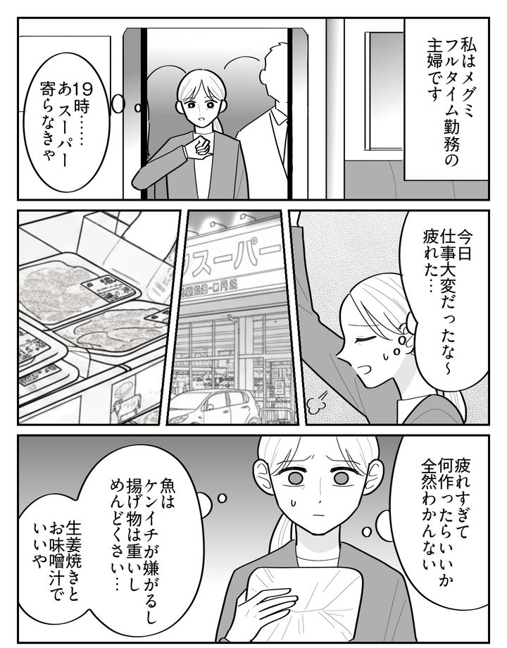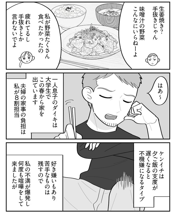 私はメグミ(47才)。一人息子のダイキは、この春大学生になって家を出ました。現在は夫のケンイチ(50才)と夫婦2人暮らしです。しかし最近、私は食事作りがゆううつになってきました。今まではダイキが喜んで食べてくれるので作りがいがあったのですが、ケンイチは私が作るものに文句ばかり。好き嫌いが多くて苦手なものは手をつけないし、感謝なんて一言もありません。私はフルタイムで仕事した後、頑張って夕食を用意しているのに……。