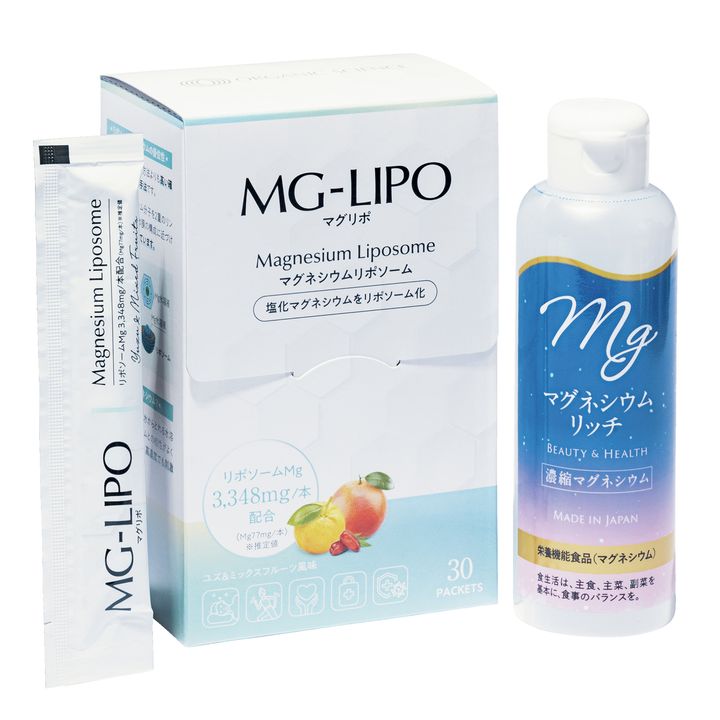 マグネシウムは神経伝達に関与し、体を緩めて副交感神経を優位にさせる重要な栄養素。体内では生成されないので、食事で補えない分は経口摂取で吸収力もアップ。左:ナチュラル成分100%の液状リポソーム化マグネシウム。マグリポ 10g×30本入り ¥8,610() 右:高知県室戸沖の海洋深層水が原料。小さじ2杯分を飲み物に混ぜて。マグネシウムリッチ 150ml ¥1,188(赤穂化成)
