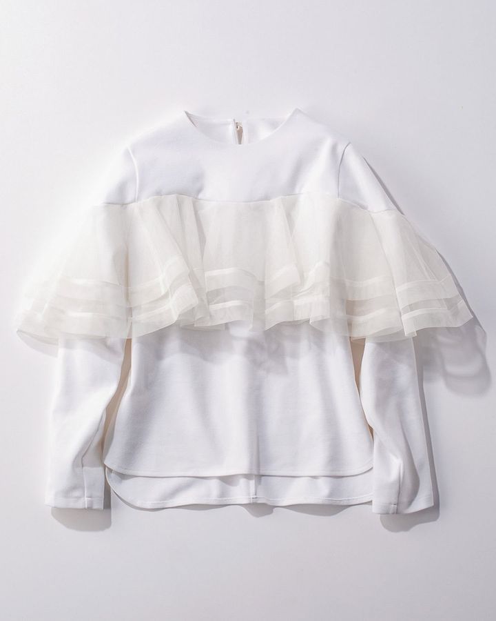 一枚での華やかさは段違い、一気にワンツーコーデのオシャレ指数が上がります。インパクトは与えても着膨れはしないようにチュールで2重のフレアを全体的に施しました。袖にもタックを入れひと工夫し、360度どこから見ても隙のないトップスです。身頃は伸縮性と柔らかな手触りが特徴のジャージー素材なので着心地も抜群。家でのお手入れが可能なのも高ポイントです。