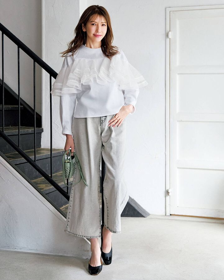 ラッフルブラウス¥17,600(シークレット・トロフィー)パンツ¥39,600(デ・プレ)バッグ¥25,300(ツル バイ マリコ オイカワ)ピアス¥3,850〈シースキー〉リング[薬指]¥24,200〈CAKI〉リング[人さし指・中指]¥15,840〈CHIRO JEWELRY〉(すべてロードス)
