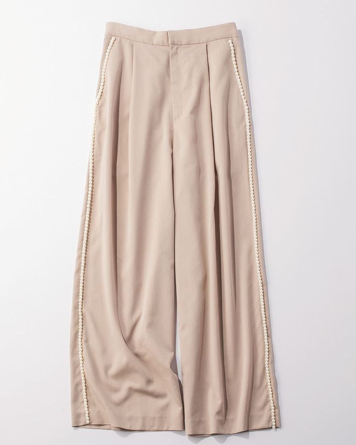 なんと人気のラインパンツのラインをパールに変えました。これならカジュアルになりすぎず、品のいい甘さを纏えます。しかもパールのラインが縦のラインを強調するので脚長効果は絶大です。ウエスト部分はゴムを使用しているので穿いていてストレスがありません。ブラックとよりカジュアルな印象のベージュの2色展開。もちろん家庭での手洗いが可能です。