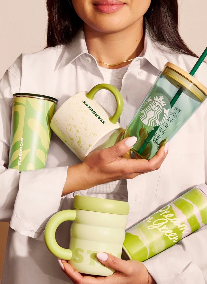ラインナップには、抹茶スプラッターマグ、ガラス製コールドカップ、波打つようなデザインの「リップル」マグやグラス、ボタニカルデザインのステンレスカップなどが並ぶ。「ドリーム・イン・グリーン」と名付けられたタンブラーは、持っているだけで気分を前向きにしてくれるはず。