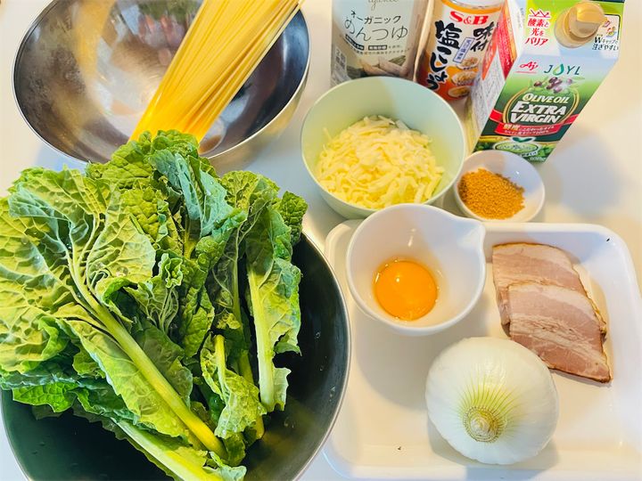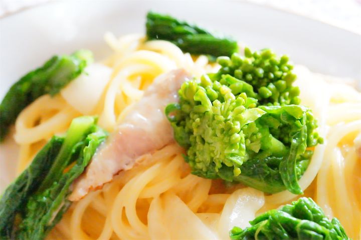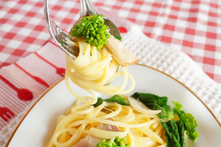 【春になったら絶対作れ】菜の花×新玉ねぎで「カルボナーラ」作ってみた!濃厚クリームが沼るおいしさ♡