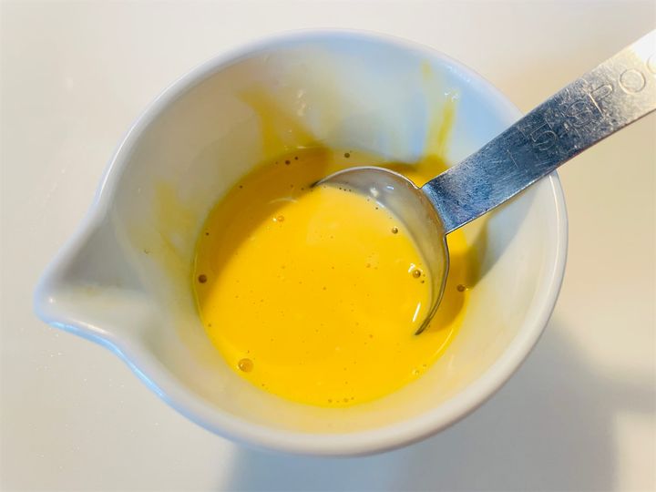2. 卵黄に分量の生クリームのうち大さじ1~2を入れ、よく混ぜておく。
