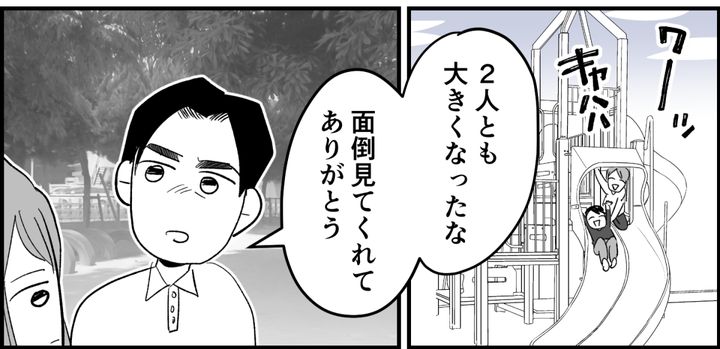 私たちの離婚が成立してから半年。「パパはお仕事の都合で一緒には暮らせないの。でも近くには暮らしているから、また会えるからね」と話したら、子どもたちは納得していました。お互いの生活が落ち着いて……今日は離婚して初めての面会の日。トシハルとは近くの公園で会いました。
