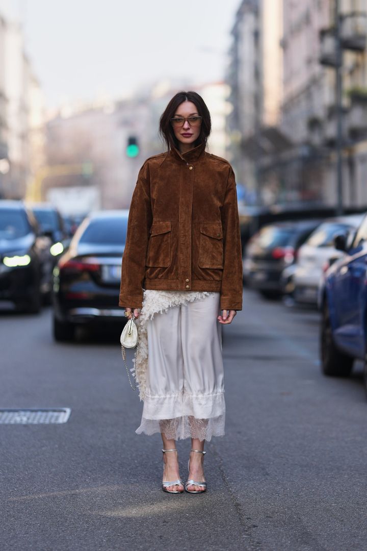 リッチなテクスチャーのスエードジャケットには、レースがあしらわれた光沢感のあるボトムスでエッジを効かせて。