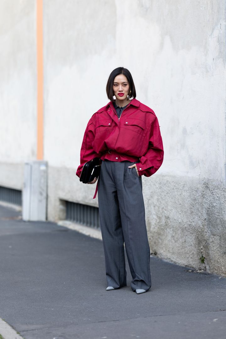 スポーティで実用的なルックに、差し色に赤をミックスしたスタイルは、あらゆるトレンドを網羅しつつも、決してやりすぎにならないのが魅力。スポーティなジャケットをジム帰りのように見せないためには、テーラードアイテムと合わせるのが重要だ。