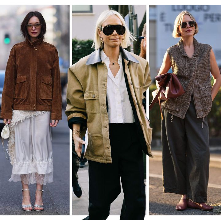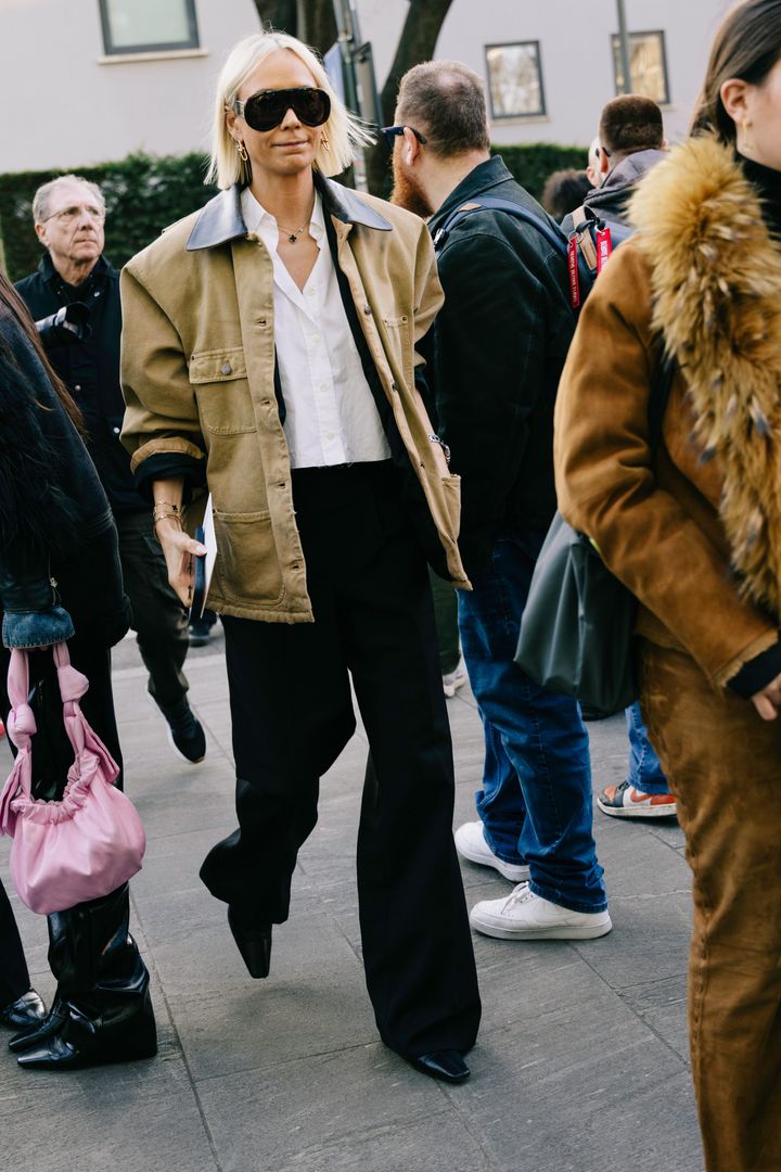NYファッションウィークのストリートでは、レオパード柄のコートが旋風を巻き起こしていたが、ミラノでの注目アウターはユーティリティジャケット。