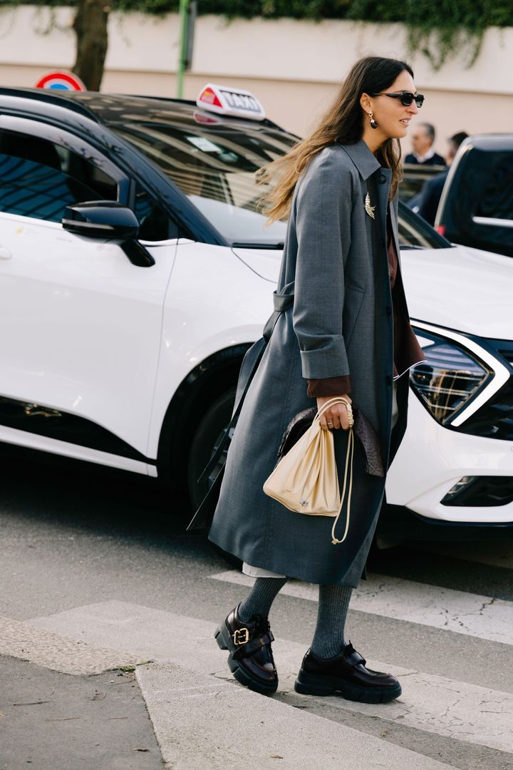 グレーのトレンチコートは、定番のベージュやカーキに代わる新鮮な選択肢のひとつ。とりわけ、装飾をプラスして立体感を出したときに、その存在感はより際立つだろう。