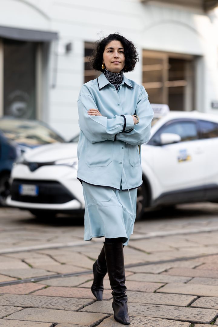 2026年春夏のランウェイを席巻したトレンドカラーのアイスブルーが、いよいよストリートにも浸透し始めている。取り入れるなら、まるでルームウェアのようにリラックス感漂うサテンのセットアップからチャレンジしてみよう。