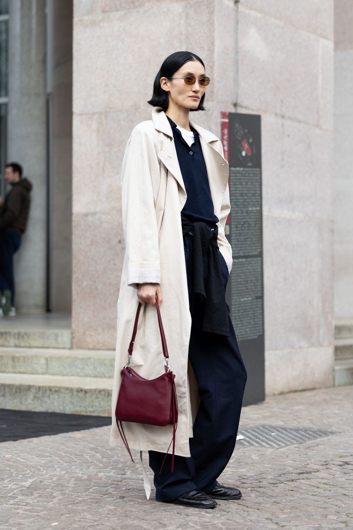 春の定番アイテムを味方につけるなら、ドレープ感のあるクリームカラーのトレンチコートを、ポロニットと白Tシャツ、シルエットがゆったりとしたボトムスに重ねてみて。さらりとまとうだけで、着心地の良さと計算されたまとまり感を同時に得られるはず。