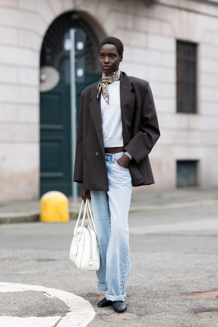 季節の変わり目を軽やかに乗り越えるためには、ベーシックアイテムをうまく活用してみて。オーバーサイズのピンストライプジャケットにシンプルなクルーネックのスウェットシャツ、そしてローライズデニムは、クローゼットに常備しておくべき失敗知らずの鉄板アイテムといえるだろう。